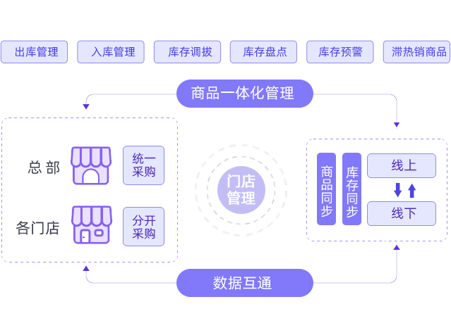 线上商城与线下门店同步商品信息,销售数据,实现线上线下商品互通、订单互通、库存互通。